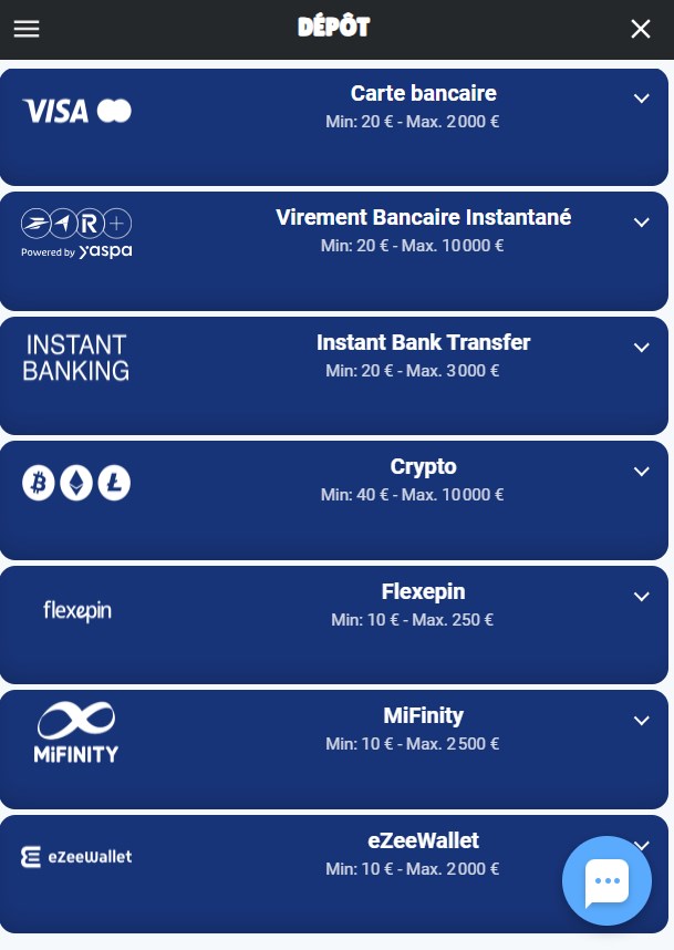 Il suffit de déposer au minimum 20 € sur le site via carte bancaire, cryptomonnaie, ezeewallet ou mifinity.