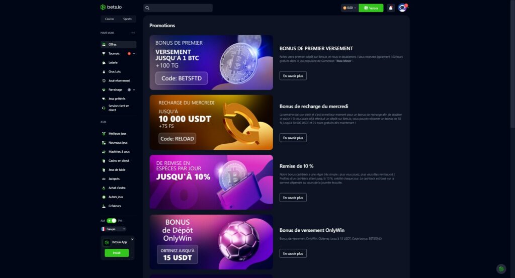 Obtenez des bonus : Bets.io offre des bonus de bienvenue attrayants pour les nouveaux joueurs, y compris des bonus sur le premier dépôt. Par exemple, vous pouvez obtenir jusqu’à 1 BTC et 100 tours gratuits avec le code « BESTFD« .