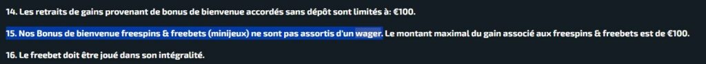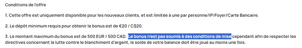 Lorsque vous jouez avec votre bonus sans wager, vous devez uniquement jouer 1 fois la totalité de votre dépôt (+bonus) pour pouvoir retirer. Le wager x1 est obligatoire pour empêcher le blanchiment d’argent, cependant, ne pas avoir de condition pour retirer est un sacré avantage.