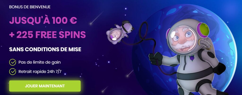 Une fois inscrit, bénéficiez du bonus bienvenue sans wager. Ce bonus est de 100% jusqu’à 50€ et 225 tours gratuits sur votre premier dépôt puis 50% jusqu’à 50€ sur le deuxième. Vous pouvez ensuite jouer sur des jeux de tables, les machines à sous, la roulette et le blackjack avec ses variantes.