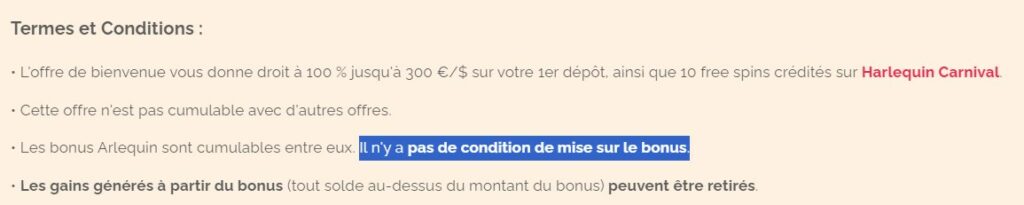 Propriété de Mountberg BV, le casino en ligne Arlequin a été créé en début d’année 2021. Pour se faire une place dans le domaine, le casino offre aux joueurs un bonus de bienvenue sans wager de 100 % allant jusqu’à 300 € et 10 tours gratuits. La ludothèque du casino est riche en jeux classiques, modernes et surtout les jeux de machine à sous les plus rares.