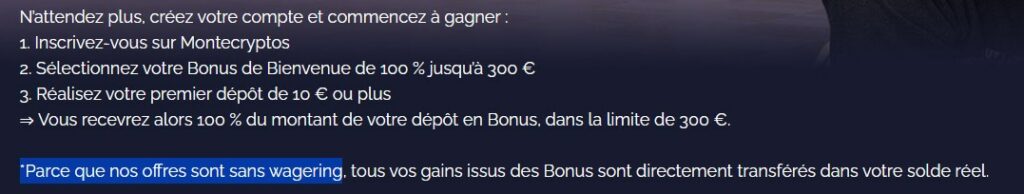 Au début de sa création, la plateforme de Montecryptos était attachée au wager. Aujourd’hui, le site de jeu ne propose que des bonus sans wager. Vous n’aurez plus besoin de réaliser les conditions de mise. Après votre inscription, votre premier dépôt est doublé jusqu’à 300 € sans wager associé.