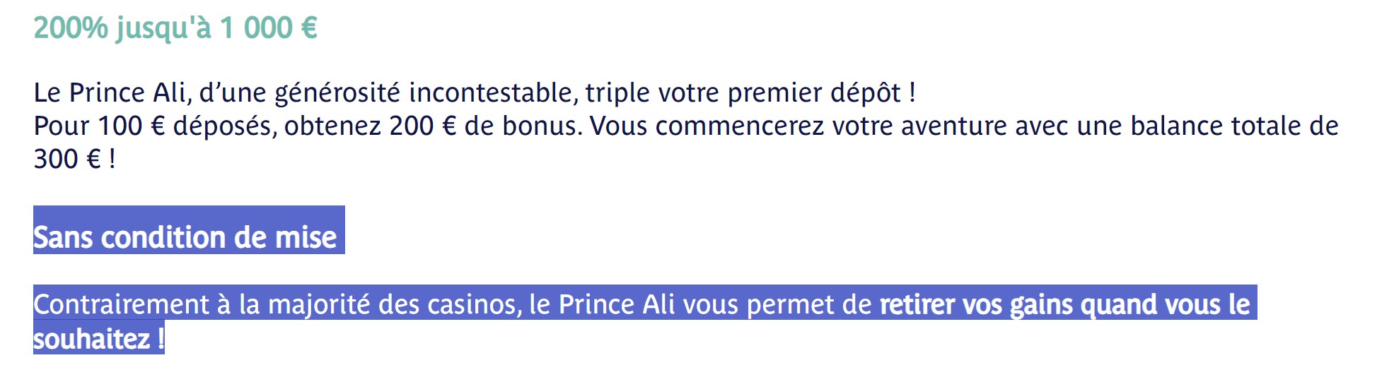 Si vous cherchez un nouveau casino en ligne sans wager, inscrivez-vous sur Prince Ali et recevez 200% jusqu’à 1000€ ! Donc si vous déposez 500€, vous commencez avec une balance de 1500€ que vous pouvez retirer à tout moment.