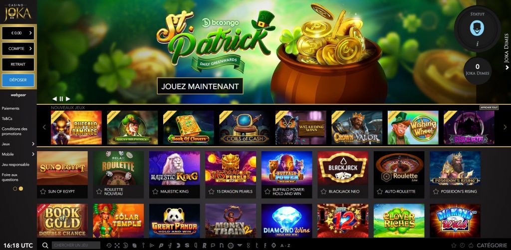 Casino Joka est un gros casino en ligne francophone, ouvert en 2019, connu également sous le nom de Joka Room. On retrouve l’ennemi juré de Batman : le Joker comme emblème du site. Finalement, derrière ce thème anti-héros, se cache un casino en ligne plutôt basique, bien que ses bonus restent assez intéressants. Niveau jeux, vous avez une grande sélection de machine à sous, avec des fournisseurs assez peu connus, malheureusement pas de casinos en direct.