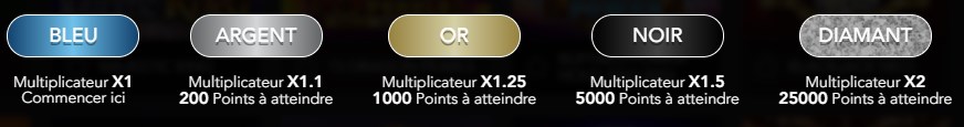 Il y a 6 paliers de points : Bleu (0 point), Argent (200 points), Or (1K points), Noir (5K points), Diamant (25K points).