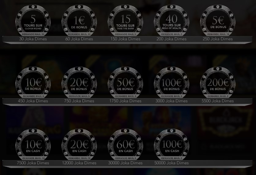 Lorsque vous gagnez des points, vous récupérez aussi des Joka Dimes, échangeable contre de l’argent sur le site. 250 Joka Dimes vous permettront de récupérer 5€, par exemple.