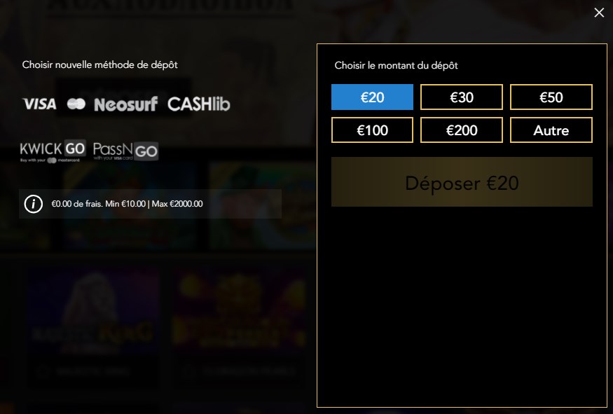 Le dépôt minimum est de 10 € et le montant maximum par transaction de dépôt est de 2000 €. Les dépôts par carte MasterCard ou Visa sont instantanés et gratuits.
