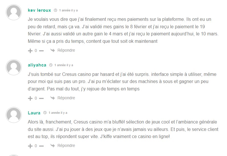 On a trouvé ici des réponses sur un post de CaptainCaz ou les joueurs semblent tout satisfaits et surpris de la bonne expérience qu’ils ont vécue sur Cresus Casino, ça fait plaisir à voir !