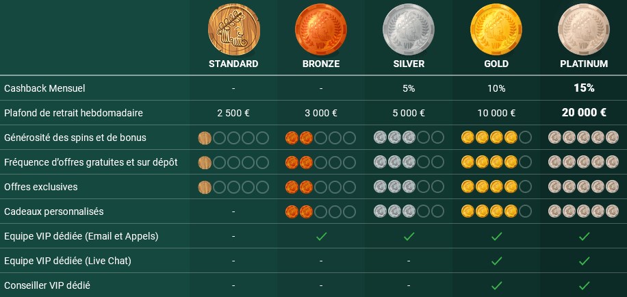 | SAV perso, paiement rapide et plus élevé, cashback, promo exclusive, cadeaux | Uniquement pour les plus gros joueurs |