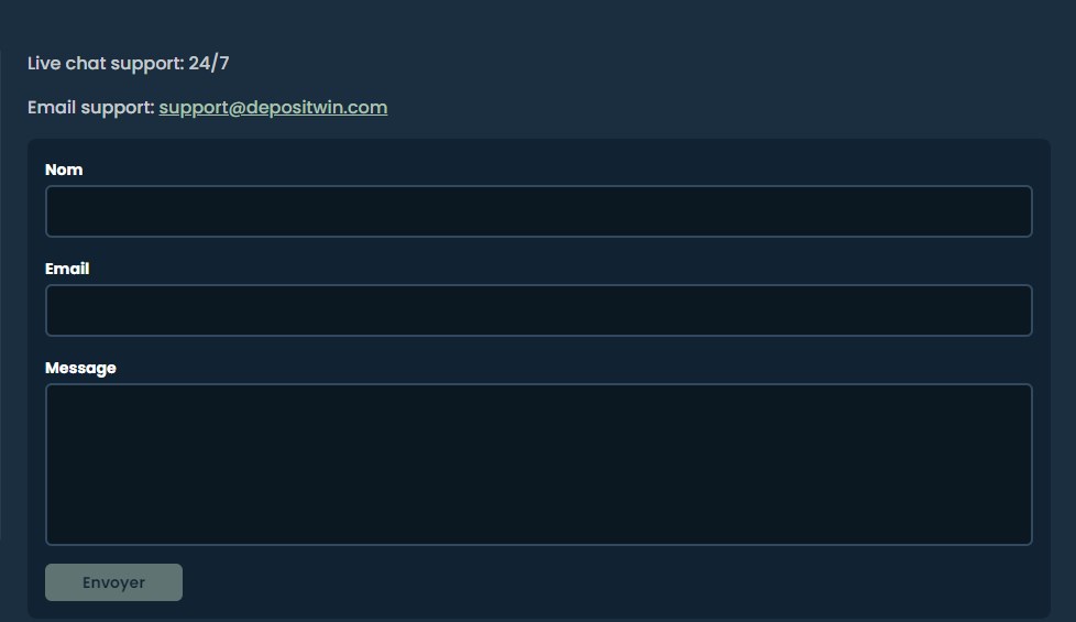 Comme toujours, nous apportons grande importance au service client des casinos que nous testons. Pour que vous soyez épaulés et aidés au quotidien, Depositwin annonce dans la rubrique « Nous contacter » avoir mis en place un support de clientèle disponible 24/7. Ce support est uniquement disponible en anglais pour le moment, mais peut être contacté par divers moyens.
