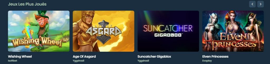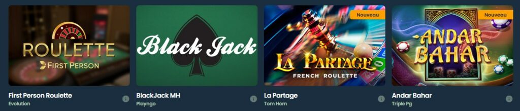 La maison de jeu est actuellement en collaboration avec certains des plus grands éditeurs de jeux de table RNG : Play’n Go, Playson, G Games, Games Global ou encore Gaming Corps et bien d’autres. Si vous voulez enchaîner rapidement les parties et tester de nouvelles stratégies avec le mode démo, ces titres sont parfaits pour vous !