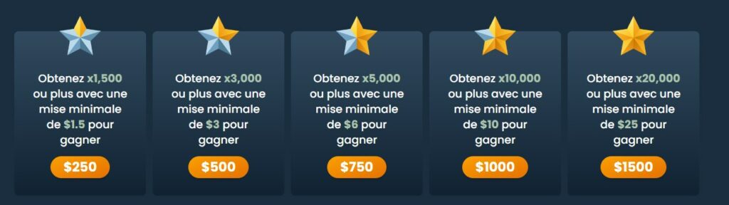 - Obtenir x20 000 ou plus avec une mise minimale de 25 € : 1 500 € de bonus.