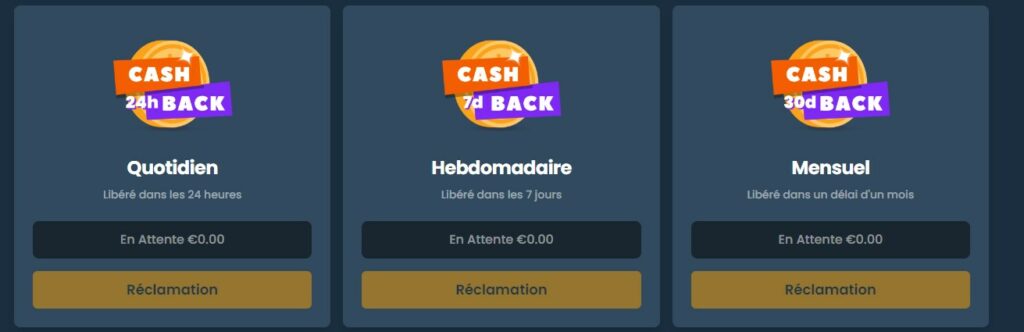 - Cashback : 5 % de cashback toutes les 24 heures, 5 % toutes les semaines et 5 % tous les mois. Vous pouvez débloquer ces bonus également dans la rubrique « Récompenses ».