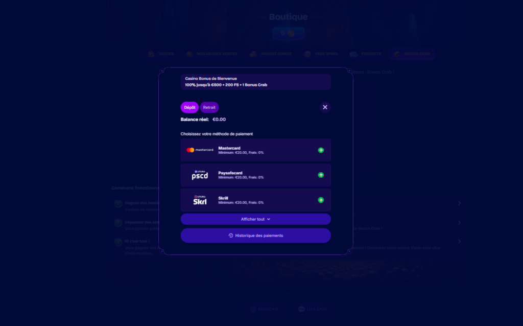 - 🎁 Réaliser un premier dépôt : 100 % jusqu’à 500 € + 200 FS + 1 Bonus Crab de boost