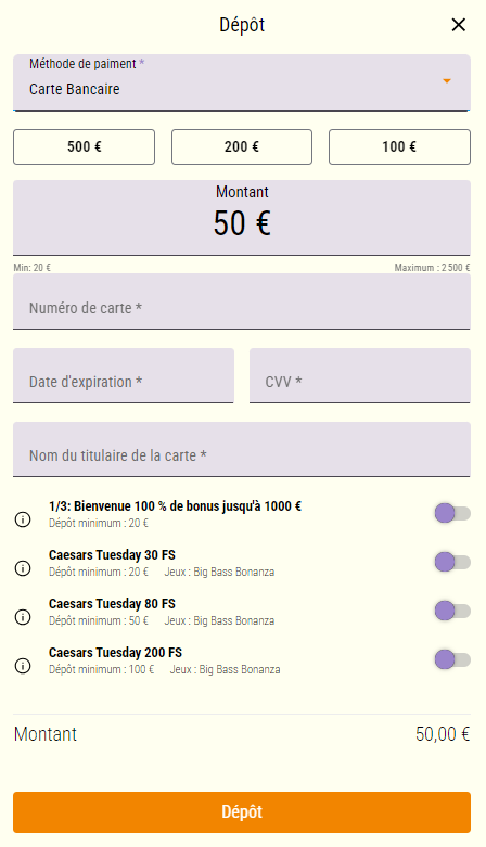 Vous n’avez qu’à vous connecter sur votre compte Julius Casino dès maintenant et cliquer sur le bouton orange « Dépôt ». Sélectionnez ensuite une méthode dans la liste (Mifinity, CB, Jeton ou encore Cryptomonnaies), renseignez un montant à partir de 20 € et procédez au paiement.