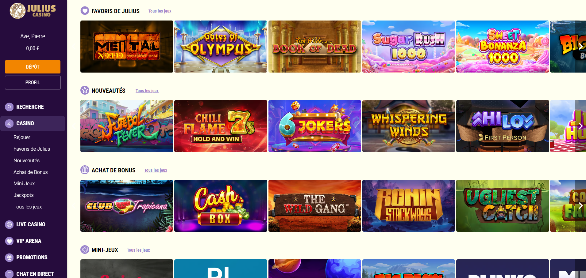 Depuis l’onglet « Favoris de Julius », nous avons pu constater que les machines à sous Sugar Rush 1000, Book of Dead, Gates of Olympus, Big Bass Bonanza et Sweet Bonanza 1000 sont largement mises en avant. Ce sont les meilleurs jeux disponibles sur le site actuellement.