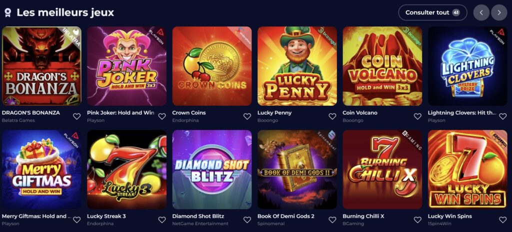 Parmi les divertissements proposés, les jeux en direct occupent une place particulière. Le site propose des titres populaires tels que Mega Ball, Dreamcatcher et Crazy Time. Ces jeux combinent interactivité et graphismes soignés, offrant une immersion totale dans l’univers du casino en ligne.