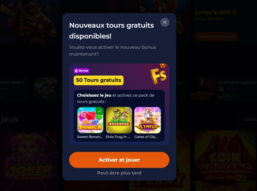 Grâce au code BLITZ3, lors de votre inscription via notre lien, vous avez le droit à 50 tours sans dépôt, utilisables sur les machines à sous Sweet Bonanza, Elvis Frog ou Gates of Olympus. Le gain maximum est de 50€, mais c’est un excellent moyen de tester le casino avant de faire votre premier dépôt.