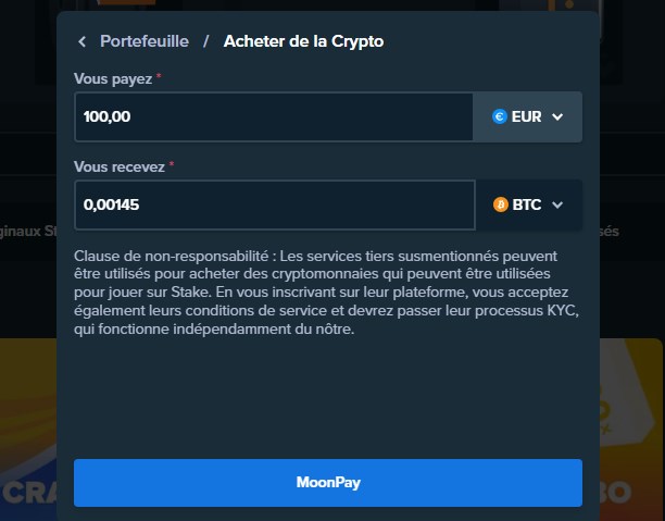 Bien qu’il n’y ait pas de devises fiduciaires disponibles, vous pouvez acheter de la cryptomonnaie directement sur le site via MoonPay.