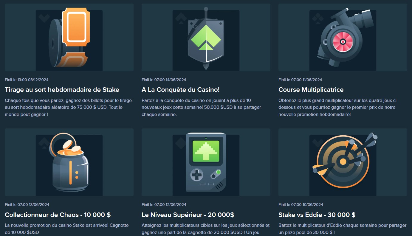 - Stake Races : Faites la course contre vos amis dans la communauté Stake pour avoir une chance de gagner entre 5000 $ et 10 000 $.