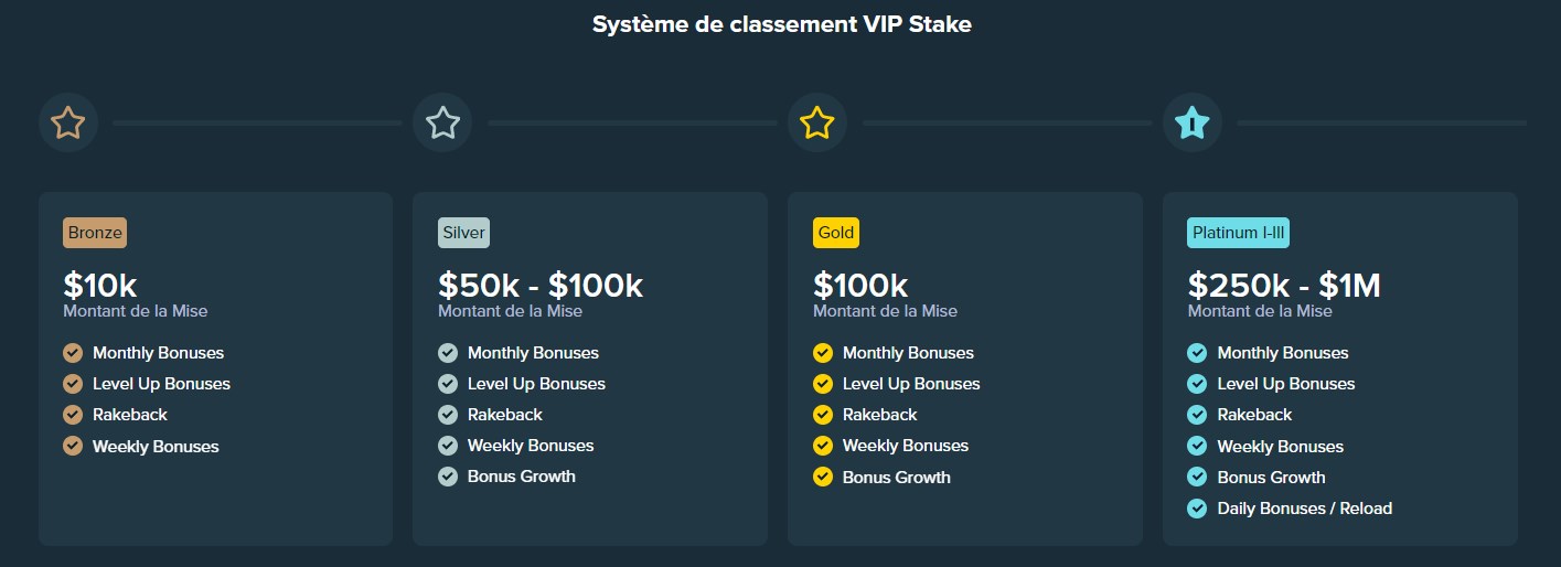 Stake propose un système VIP très avantageux pour les joueurs. Il y a différents niveaux de VIP : Bronze, Argent, Or, Platine, Diamant et Obsidian.