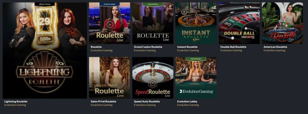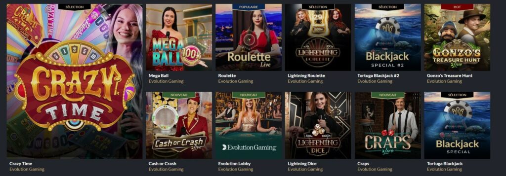 Grâce au fournisseur Evolution Gaming, vous pouvez accéder à des tables de blackjack en direct avec un croupier réel. Vous pouvez discuter avec lui et les autres joueurs, pour vous sentir au casino depuis chez vous. Il y a également les autres jeux en direct d’Evolution Gaming comme Crazy Time ou Monopoly Live par exemple.