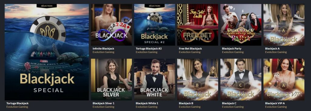 Chez Tortuga, vous pourrez jouer à différents jeux de blackjack, dont le blackjack classique, le blackjack à la première personne, le blackjack Royal Pairs, le blackjack multi-handle, et bien d’autres encore.
