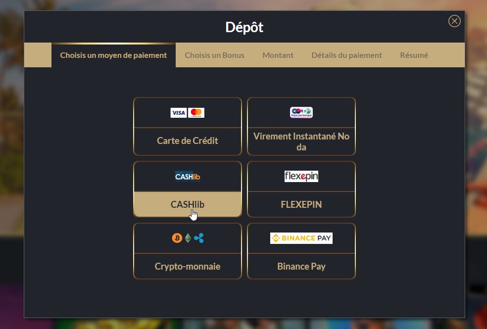 Pour les pays francophones, vous pouvez payer via carte bancaire, cashlib, Virement bancaire, Flexepin, Cryptomonnaie, EzeeWallet et Jeton Wallet.