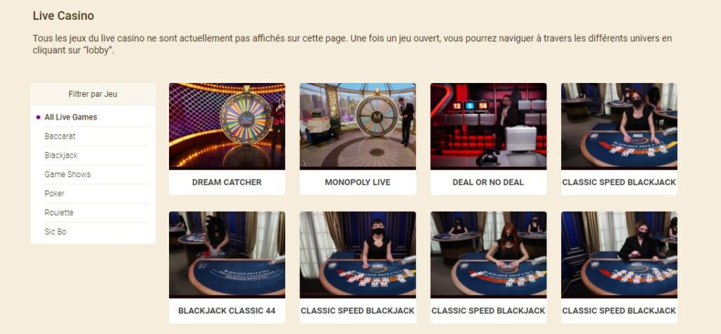 Vous pouvez également jouer à la roulette et au blackjack contre de vrais croupiers dans le casino en direct.