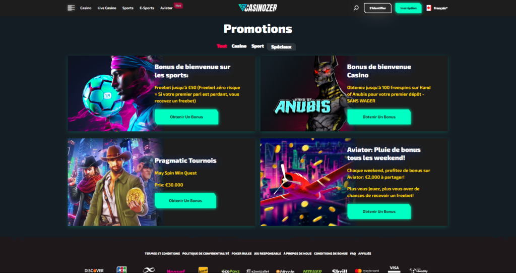 - Obtenez des bonus : Casinozer offre des bonus de bienvenue, y compris jusqu’à 100 free spins sans wager. Cliquez sur « Obtenir Un Bonus » pour profiter de ces offres.