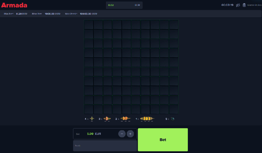 Le mini-jeu Armada (jeu de la bataille navale) par Mystake est extrêmement simple, permettant à n’importe quel joueur de facilement le prendre en main. Le RTP étant de 99%, vous avez de grande chance de gagner, cependant n’oubliez pas de vous fixer des limites. En misant seulement 20 centimes, vous pouvez vous amuser tout en faisant des petits gains.