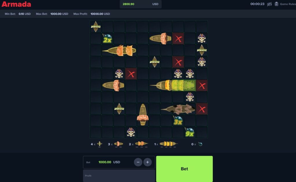 Les règles de Armada sont très simples. Vous avez une grille composée de bateaux, de bombes et de squelettes. Si vous tombez sur un bateau, votre mise est multiplié, mais si vous avez 5 échecs d'affilés ou que vous tombez sur un squelette, vous perdez.