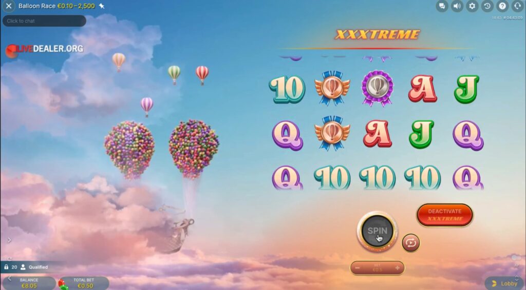La première étape pour tout joueur de Balloon Race Live est de compléter la phase de qualification. Cette phase se joue comme une machine à sous en ligne où il faut obtenir soit trois symboles scatter ou trois wilds expansifs pour progresser. Pour augmenter vos chances de succès, des options telles que les « XXXtreme Spins » et « Super XXXtreme Spins » sont disponibles. Bien qu’elles soient coûteuses, elles garantissent la présence de symboles scatter ou wild expansifs supplémentaires, facilitant votre progression vers la phase suivante.