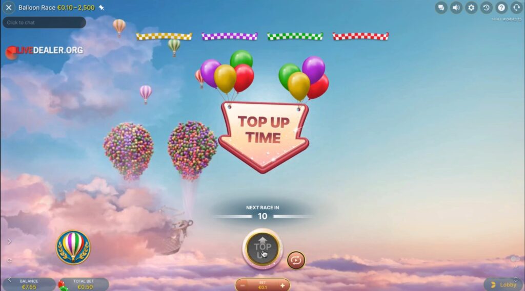 Une fois la phase de qualification achevée, les joueurs se dirigent vers la phase ‘Top Up’. Cette étape permet aux joueurs de libérer entre trois à six ballons, augmentant ainsi leurs multiplicateurs de gains potentiels. En cliquant sur le bouton ‘Top Up’, vous relâchez des ballons qui flottent vers le haut, chacun attribuant un multiplicateur distinct.