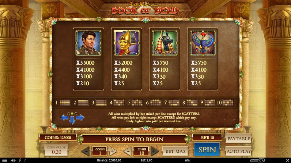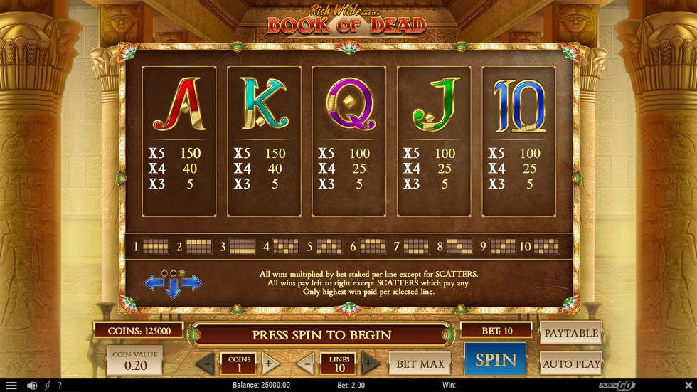 Book of Dead comporte une grille de bobines standard de 5×3 et bénéficie de 10 lignes de paiement, qui paient de gauche à droite, en commençant par la bobine la plus à gauche.