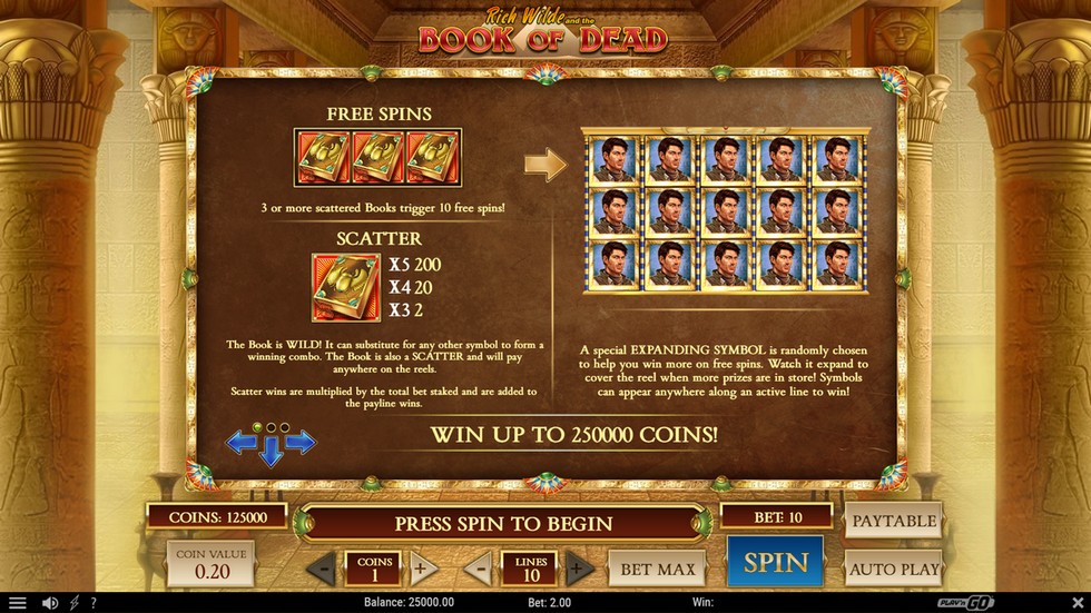 Rich Wilde est de retour ! Vous l’avez sans doute déjà vu sur les machines à sous, The Aztec Idols, The pearls of India, The Tome of Madness ou encore The Shield of Athena. Ce célèbre aventurier qui vous rappellera Indiana Jones s’est attelé à une nouvelle tâche : découvrir les trésors des pharaons égyptiens, perdus depuis longtemps. Aidez Rich Wilde à chercher le Livre des Morts et vous deviendrez riche au-delà de vos rêves les plus fous.