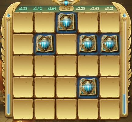 Le tableau de jeu est composé de plusieurs cases que le joueur doit cliquer pour révéler soit des multiplicateurs de gains, soit des mines (Têtes d’Anubis). Le but est de continuer à ouvrir des cases sans tomber sur une mine afin d’accumuler des gains. Plus le joueur progresse dans le jeu, plus les multiplicateurs augmentent, offrant ainsi des opportunités de gains plus importants. Plus de risques, plus de récompenses.
