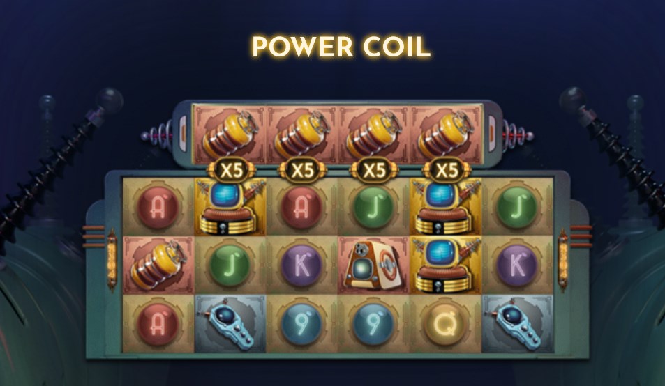 Au-dessus des rouleaux 2 à 5, vous verrez une bobine qui tourne horizontalement. Il s’agit du Power Coil. Il vous rappellera la rangée supérieure que l’on trouve dans Megaways. Quoi qu’il en soit, les wilds ne peuvent atterrir que sur le Power Coil.