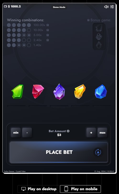 Alors, tentez votre chance avec le jeu de mines Crystal Poker de Turbo Gaming et remportez des récompenses uniques sur Casinozer !