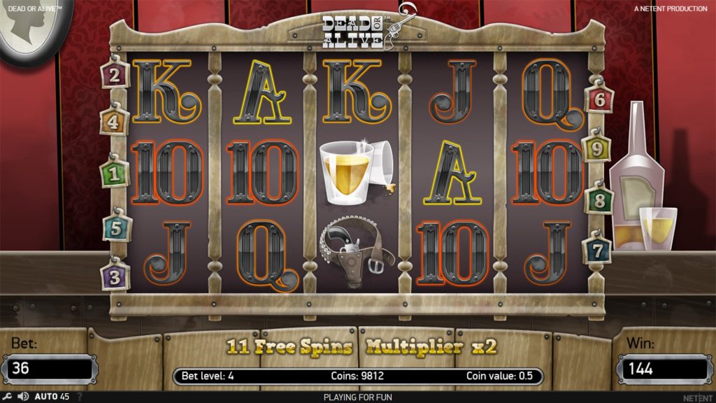 Les règles du jeu sont la partie la moins effrayante de la version 2013 car il est si facile de jouer à Dead or Alive que vous ferez tourner les rouleaux comme un véritable tireur rapide en un rien de temps. Ce classique de NetEnt comporte cinq rouleaux, trois rangées et bénéficie de 9 lignes de paiement fixes, qui paient de gauche à droite, en commençant par le rouleau le plus à gauche. Faites apparaître au moins trois symboles identiques sur une ligne de paiement si vous voulez commencer à gagner des gains. Le symbole Scatter est le seul symbole qui rapporte même pour une paire de symboles et il rapporte sur n’importe quelle position sur les rouleaux.