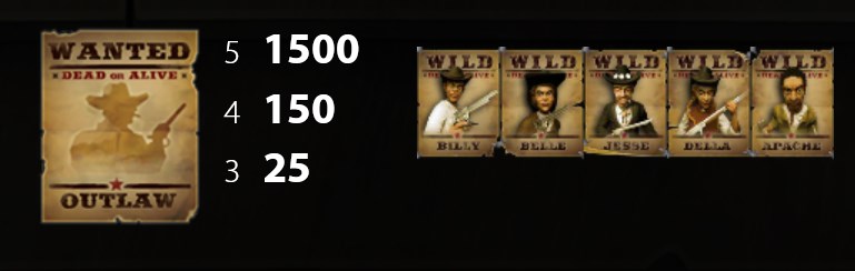 Les rouleaux de cette machine à sous vidéo sur le thème du western spaghetti se trouvent dans un ranch désert et tout ce que vous pouvez entendre, ce sont les hiboux et les chiens de prairie. Les symboles qui peuplent les rouleaux sont l’insigne du shérif, un pistolet avec des balles, un chapeau de cowboy, une paire de bottes de cowboy et un verre de whisky. Les symboles peu rémunérateurs sont représentés par des cartes à jouer 10-A. L’avis de recherche est le Wild qui remplace tous les autres symboles sauf le Scatter, qui déclenche la fonction Tours Gratuits. Deux pistolets croisés avec trois balles sont utilisés comme Scatter. Posez au moins trois d’entre eux pour activer les tours gratuits.