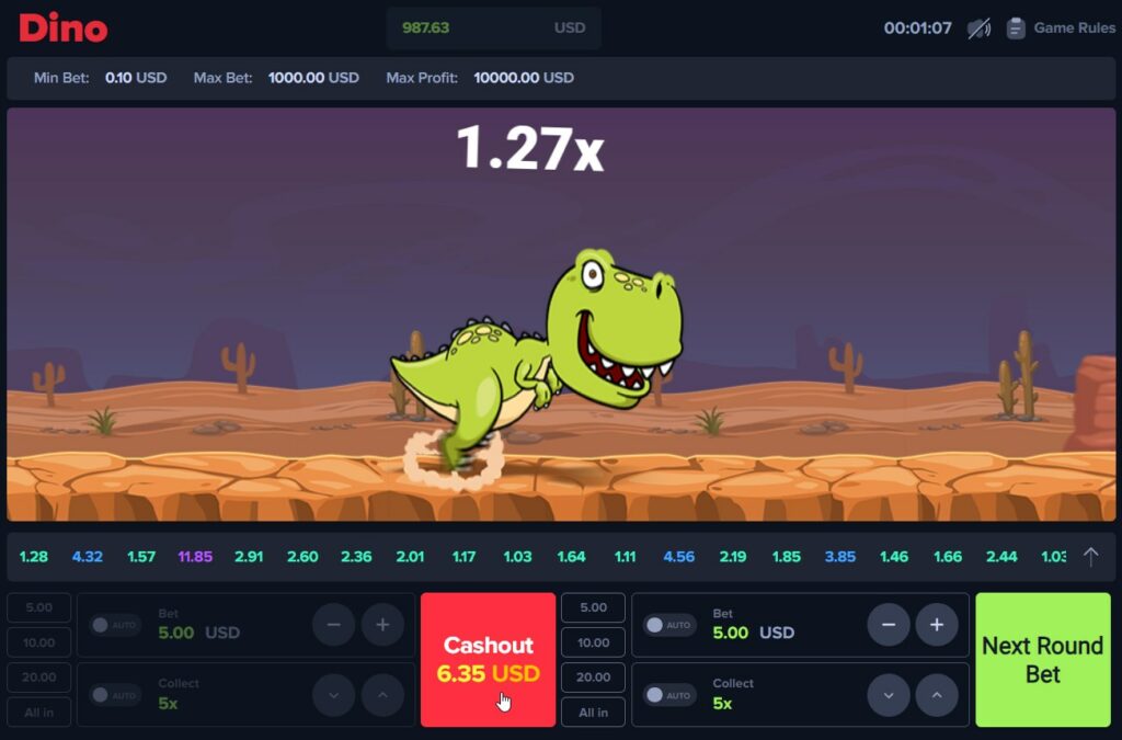 L’idée derrière Dino est ingénieusement simple. Un dinosaure court le long d’une piste, avec un multiplicateur qui augmente, et vous devez sortir avant que la météorite ne s’écrase pour gagner votre mise multipliée par le chiffre indiqué lorsque vous êtes sorties. S’il s’écrase avant que vous ne sortiez, vous perdez. Tout se passe en temps réel, en quelques secondes.