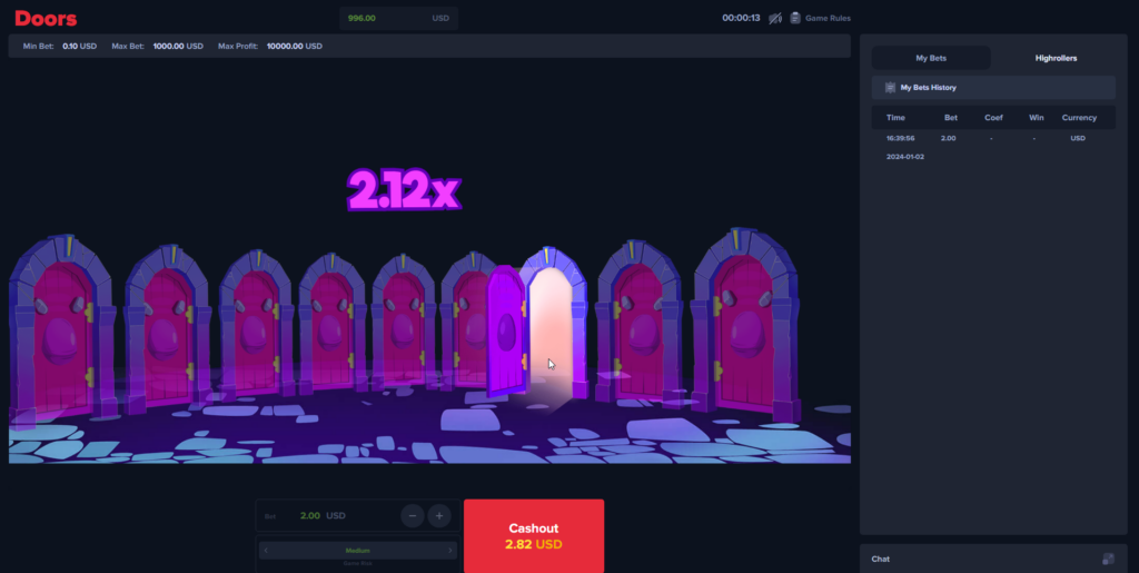 De plus, Doors Mystake est doté de la fonctionnalité de Cash out qui permet de récupérer vos gains à tout moment. Un bouton rouge est disponible pour réaliser cette action afin de retirer instantanément les bénéfices et éviter de tout perdre en ouvrant une porte piégée.