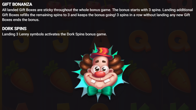 À part la fonctionnalité-cadeaux en folie, il y a le mode free spins. Il se déclenche avec trois symboles Lenny combinés. Avec cette fonctionnalité, un des ringards de la Dork Unit ajoute un multiplicateur permettant de booster le gain de la ligne gagnante à chaque tour. L’apparition d’un symbole Lenny sur l’un des trois rouleaux pendant le long métrage transforme ce dernier en un rouleau Wild Dork pour une durée du bonus round. Les Clowns Wilds étendus atterriront sur les rouleaux Dork Wild et ils sont livrés avec des gammes de multiplicateurs spécifiques aux personnages comme suit :
