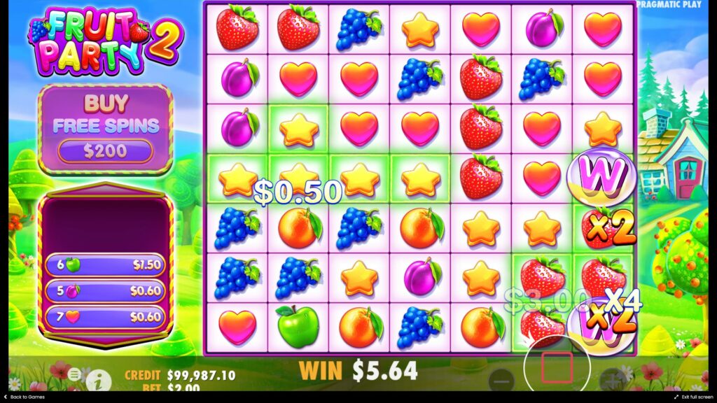 Fruit Party 2 est une machine à sous en ligne alimentée par Pragmatic Play, qui se déroule sur une grille 7×7 et propose des gains en grappe. Les fonctionnalités comprennent des cascades, des tours gratuits et des multiplicateurs qui peuvent augmenter jusqu’à 729x. Le RTP de cette machine à sous à haute volatilité peut varier de 94,46% à 96,53% et son premier prix vaut 5000x.