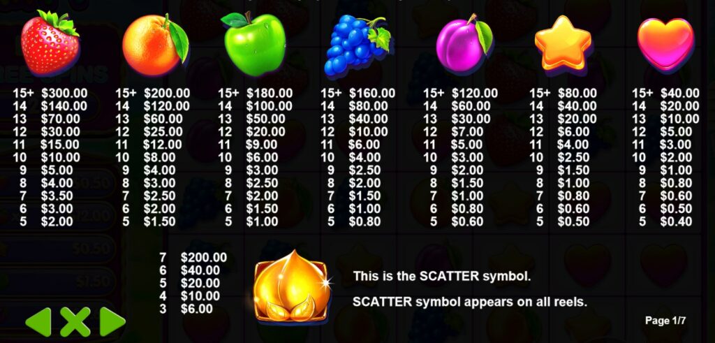 Des cascades sont également présentes dans la démo de Fruit Party 2. Ainsi, chaque fois que vous obtenez une combinaison gagnante, les symboles qui faisaient partie du gain disparaissent pour faire place à de nouveaux symboles.