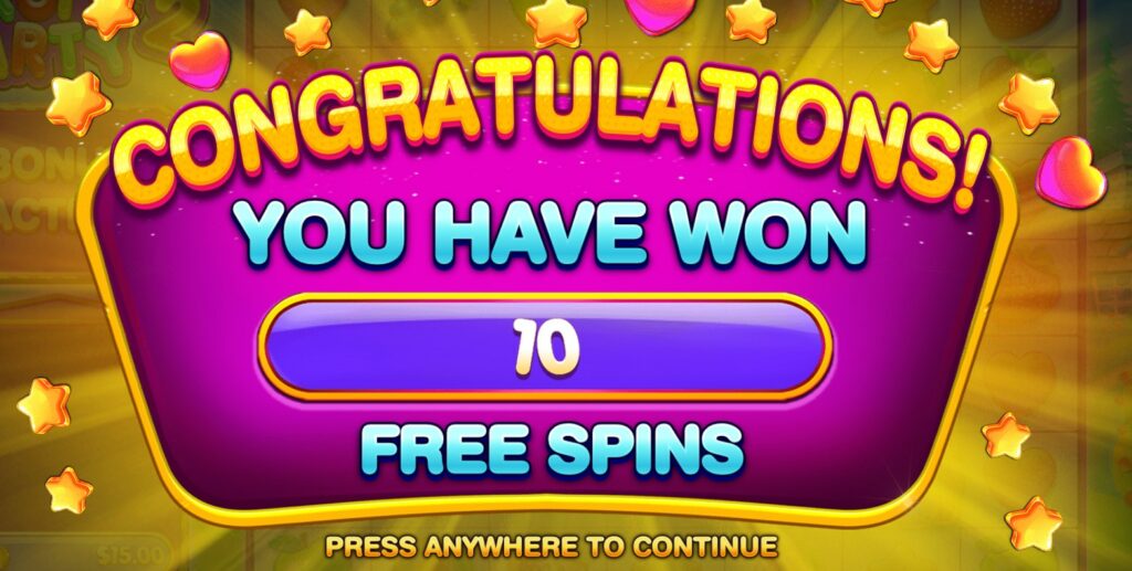 Les symboles Golden Fruits qui apparaissent dans la machine à sous Fruit Party 2 déclenchent les tours gratuits si vous en obtenez trois ou plus. Vous pouvez obtenir entre 10 et 25 tours gratuits en fonction du nombre de scatters qui apparaissent sur les rouleaux.