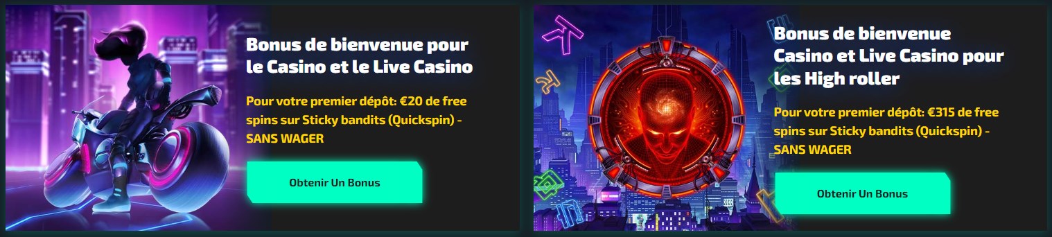 Casinozer propose deux bonus différents sur votre premier dépôt. Si vous ne comptez pas déposer une grosse somme sur Casinozer, c’est le premier Bonus qui vous offre 20 € de Free Spins sur Sticky Bandit qui va vous intéresser.
