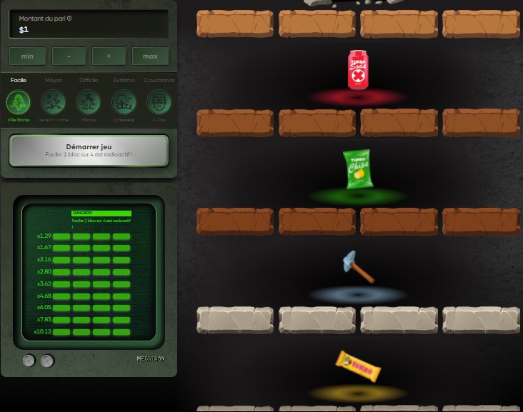 Afin d’obtenir somme maximale que ce jeu peut vous offrir, il vous faudra sélectionner le mode 5, soit Nightmare, puis miser 100 euros qui est la somme maximale, et enfin arriver jusqu’à la fin. Si vous parvenez à éviter toutes les pierres radioactives, vous pourrez gagner jusqu’à 10 000 euros !