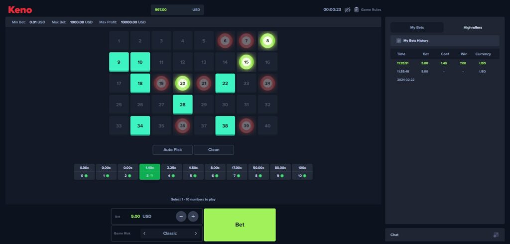 Keno 40 se joue avec des boules numérotées de 1 à 40. Au milieu des animations et des graphismes très colorés, un tableau de nombres apparaît à l’écran. Le joueur est appelé à sélectionner 1 à 10 numéros au hasard parmi ceux-ci. À son tour, le casino en ligne choisit le même nombre de chiffres.
